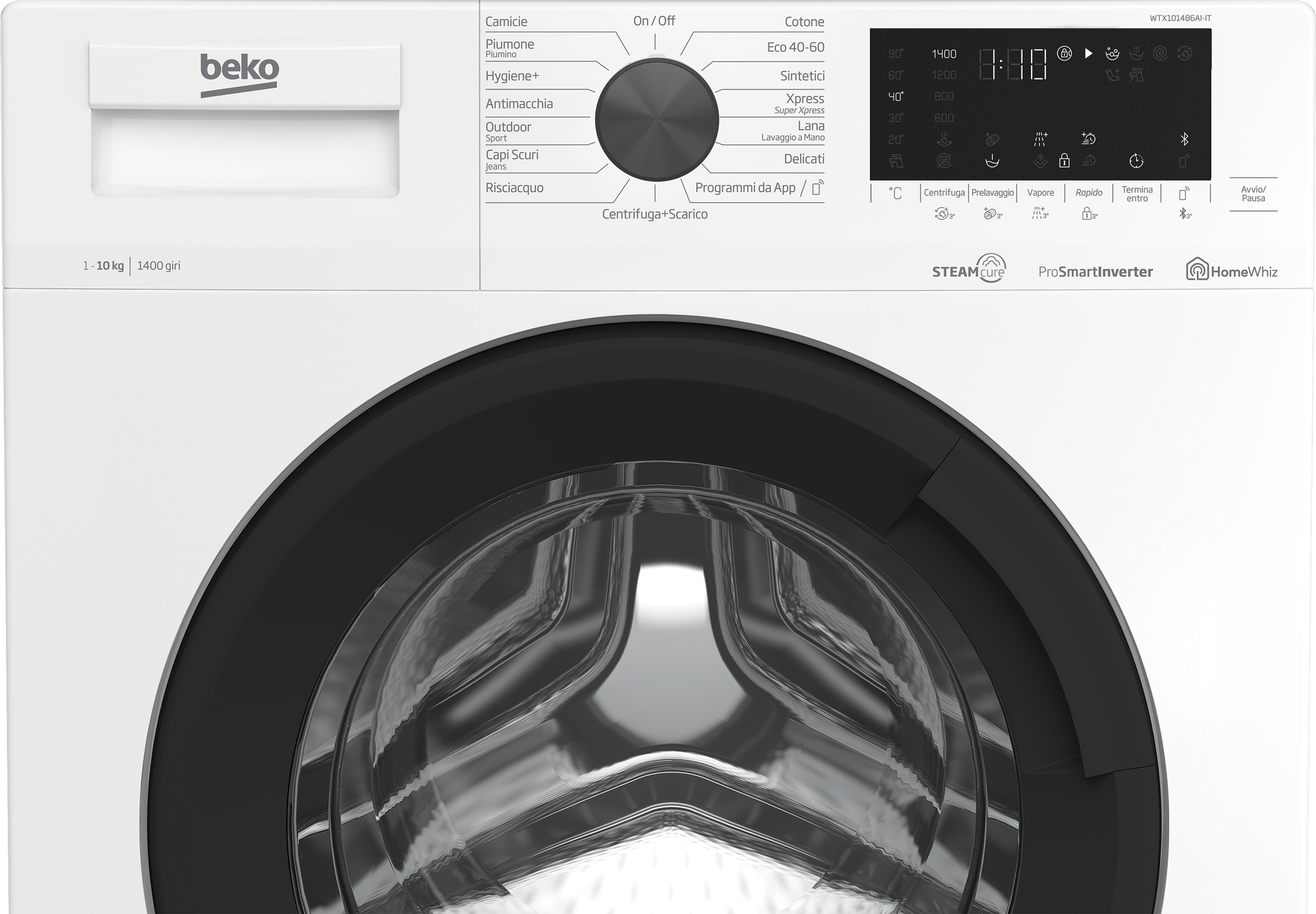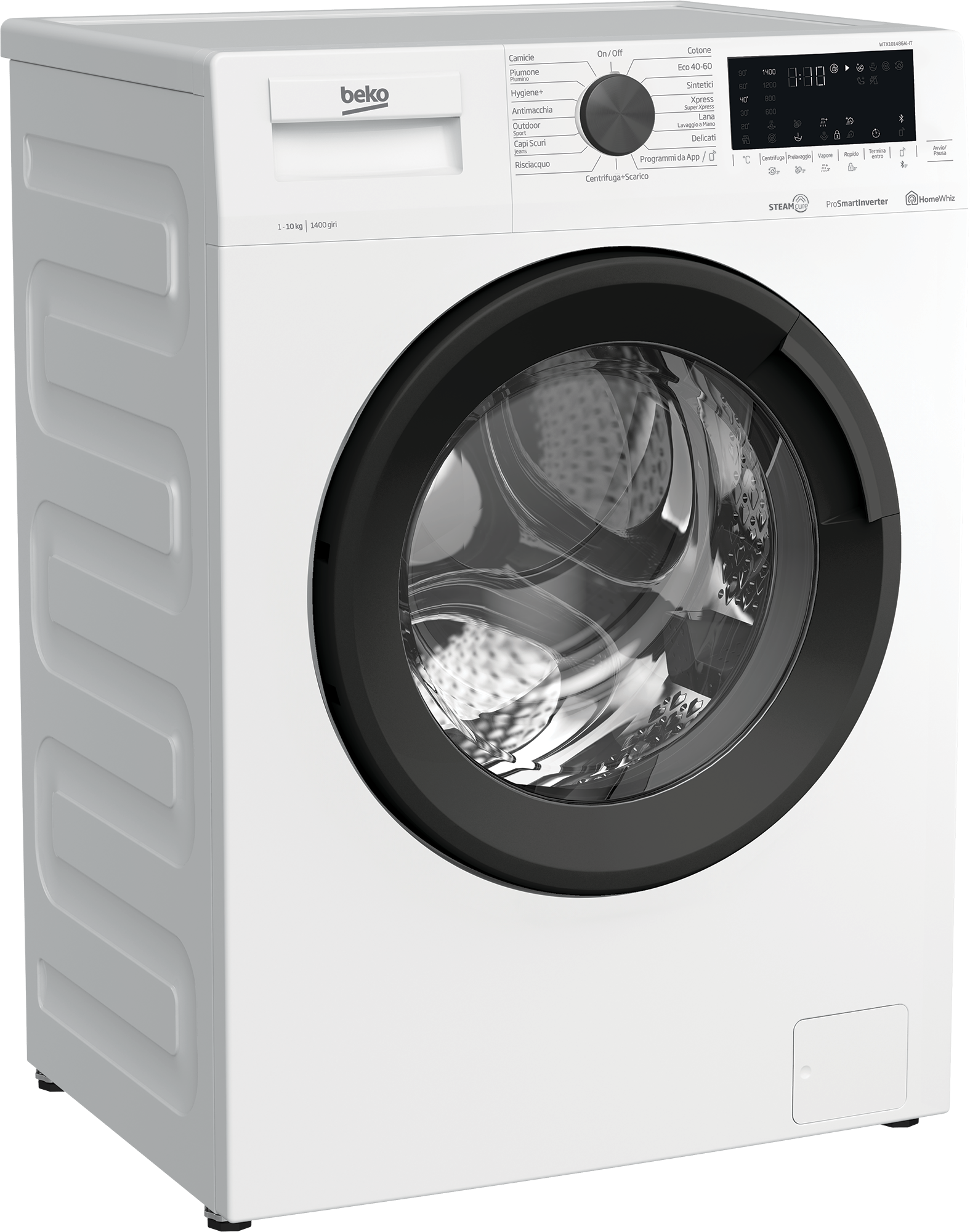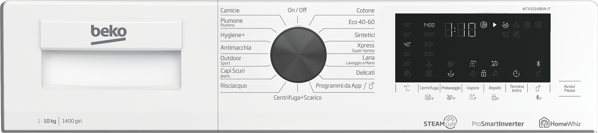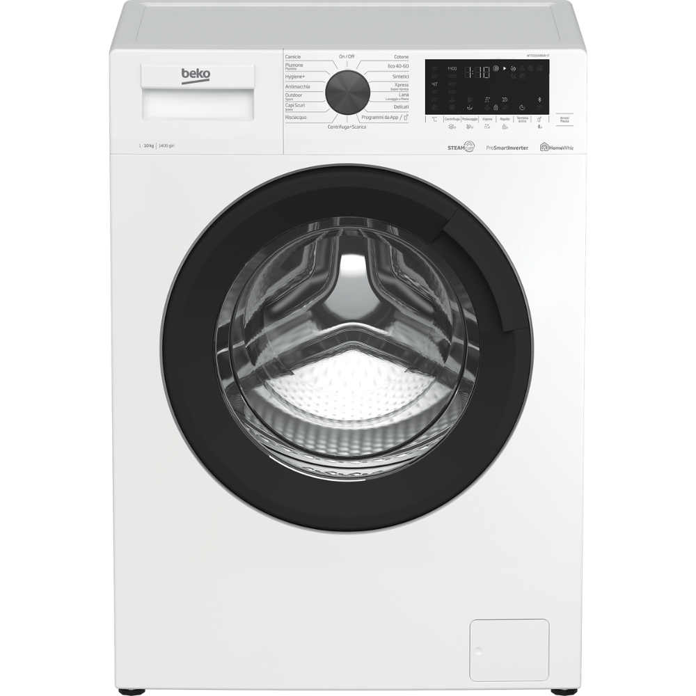 La lavatrice Beko WTX101486AI è un modello a carica frontale con una capacità di 10 kg e una velocità di centrifuga fino a 1400 giri/min. Offre una classe energetica A e una classe di centrifuga B, con un consumo energetico di 51 kWh per 100 cicli. Ha un display LED touch, 15 programmi di lavaggio, e funzioni aggiuntive come la partenza ritardata, protezione bambini, e la tecnologia SteamCure™ per rimuovere pieghe e igienizzare il bucato. È anche connessa tramite HomeWhiz per un controllo remoto.